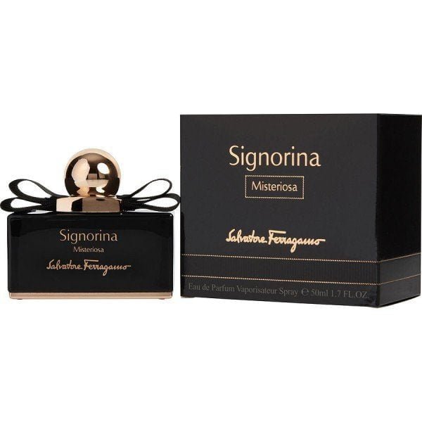 On découvre Signorina, une jeune fille qui devient femme. Elle veut vivre et révéler un nouvel aspect de sa personnalité. Elle peut être une Signorina différente quand elle le souhaite et porter un parfum différent selon son humeur. L’imprévu est son emblème, le mystère est son essence. Signorina Misteriosa est vétu de noir , la couleur de toutes les filles chic et mystérieuse. Le mystère de la couleur noire se fond et se mélange parfaitement avec l’éclat de l’or rose.