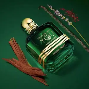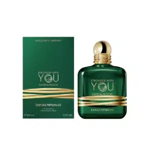 Le flacon de *Stronger With You Sandalwood* conserve la silhouette arrondie et moderne de la collection Emporio Armani, avec une teinte vert intense symbolisant à la fois la nature, la fraîcheur et l’énergie spirituelle. Ce flacon agit comme un talisman contemporain, capturant la force et l’attraction du bois de santal dans une esthétique raffinée et minimaliste.